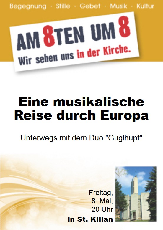 Zu einer musikalischen Reise durch Europa lädt die Initiative „Am 8. um 8 - Wir sehen uns in der Kirche“ ein. Das Duo „Guglhupf" wird Volkslieder und Tänze aus verschiedenen Kulturen Europas aufführen und die Musik mit passenden Texten ergänzen.