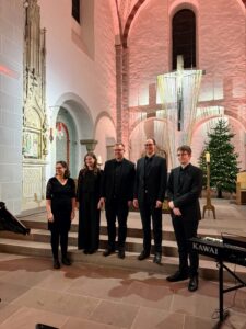 Schon direkt zu Beginn ist es Zeit für einen Gänsehautmoment, als Altistin Victoria Schmidt mit ihrer warmen Stimme das Konzert mit „Wir sagen euch an den lieben Advent“ eröffnet. Nach und nach kommen die anderen Quartettmitglieder hinzu, sodass sich ein vierstimmiger Gesamtklang entwickelt. Es folgen weitere Adventslieder wie „Maria durch ein Dornwald ging“ oder „Es ist ein Ros entsprungen“. Neben klassischer Weihnachtsliteratur stehen aber auch moderne Arrangements wie „Hört der Engel hellen Lieder“ von der a-capella-Gruppe Maybebop oder Kompositionen von John Rutter auf dem Programm. Diese gut gewählte Abwechslung prägt den gesamten Konzertabend.